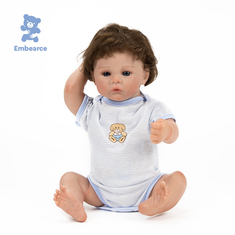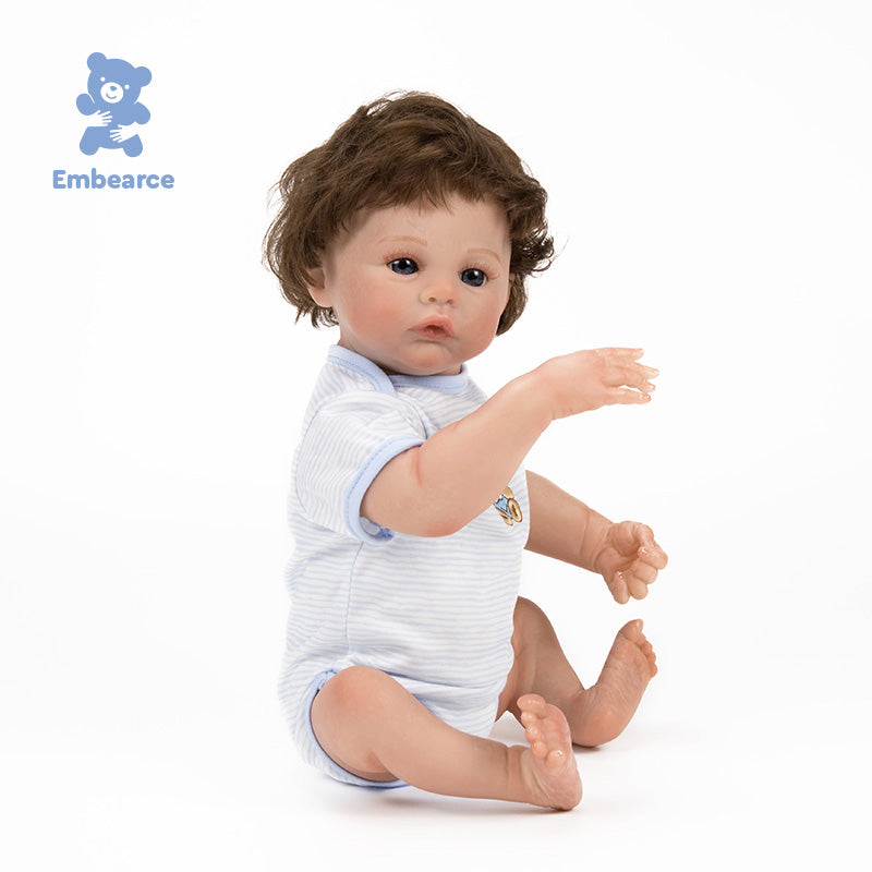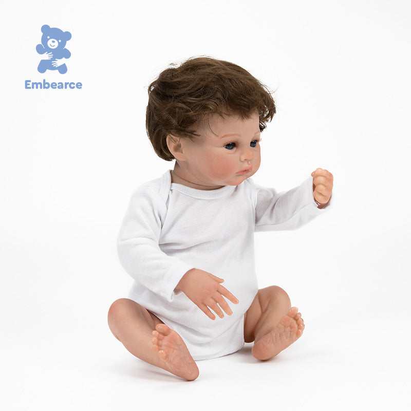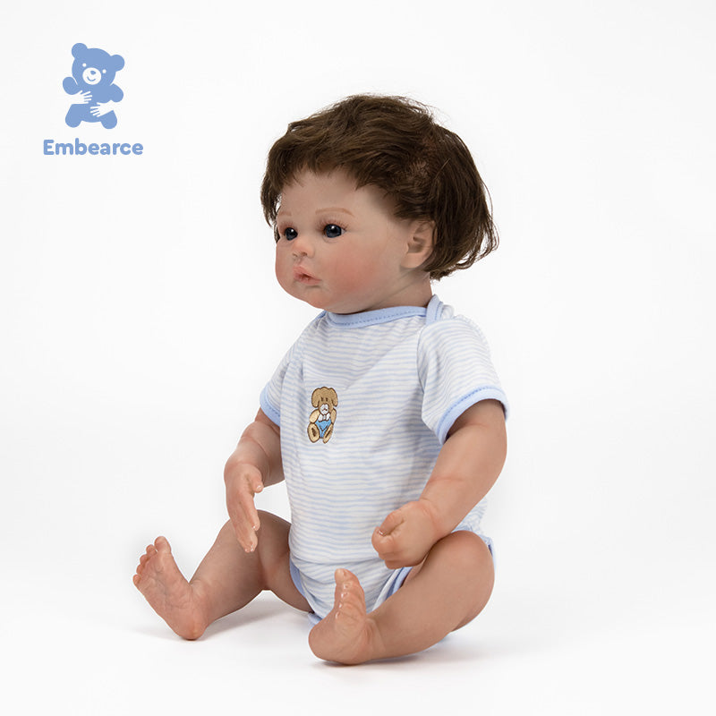 The artisanal craftsmanship on his skin is striking: every subtle vein, every mottle, and every rosy nuance has been hand-painted to offer a visual and tactile realism that is breathtakingly true to life. His 18-inch (45 cm) size was designed to nestle naturally in your arms, offering a sensation of weight and warmth that soothes the spirit.