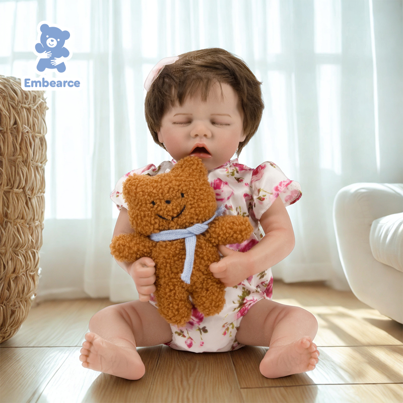 The artisanal craftsmanship on his skin is striking: every subtle vein, every mottle, and every rosy nuance has been hand-painted to offer a visual and tactile realism that is breathtakingly true to life. His 18-inch (45 cm) size was designed to nestle naturally in your arms, offering a sensation of weight and warmth that soothes the spirit.