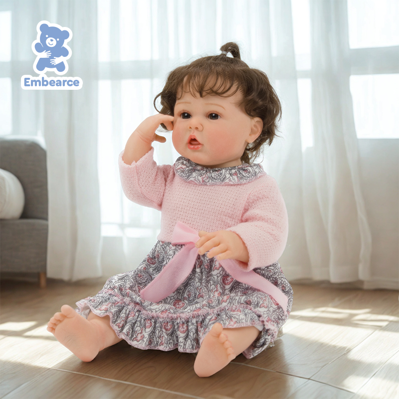 The artisanal craftsmanship on his skin is striking: every subtle vein, every mottle, and every rosy nuance has been hand-painted to offer a visual and tactile realism that is breathtakingly true to life. His 18-inch (45 cm) size was designed to nestle naturally in your arms, offering a sensation of weight and warmth that soothes the spirit.